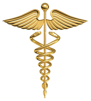The caduceus [kuh-doo-see-uhs] is a herald’s staff, a symbolic object representing Hermes (or the Roman Mercury), and by extension trades, occupations or undertakings associated with the god. It is today typically depicted as a short staff entwined by two serpents in the form of a double helix, and is sometimes surmounted by wings. The caduceus is sometimes used as a symbol of medicine and/or medical practice, especially in North America, due to widespread confusion with the traditional medical symbol, the rod of Asclepius, which has only a single snake and no wings.