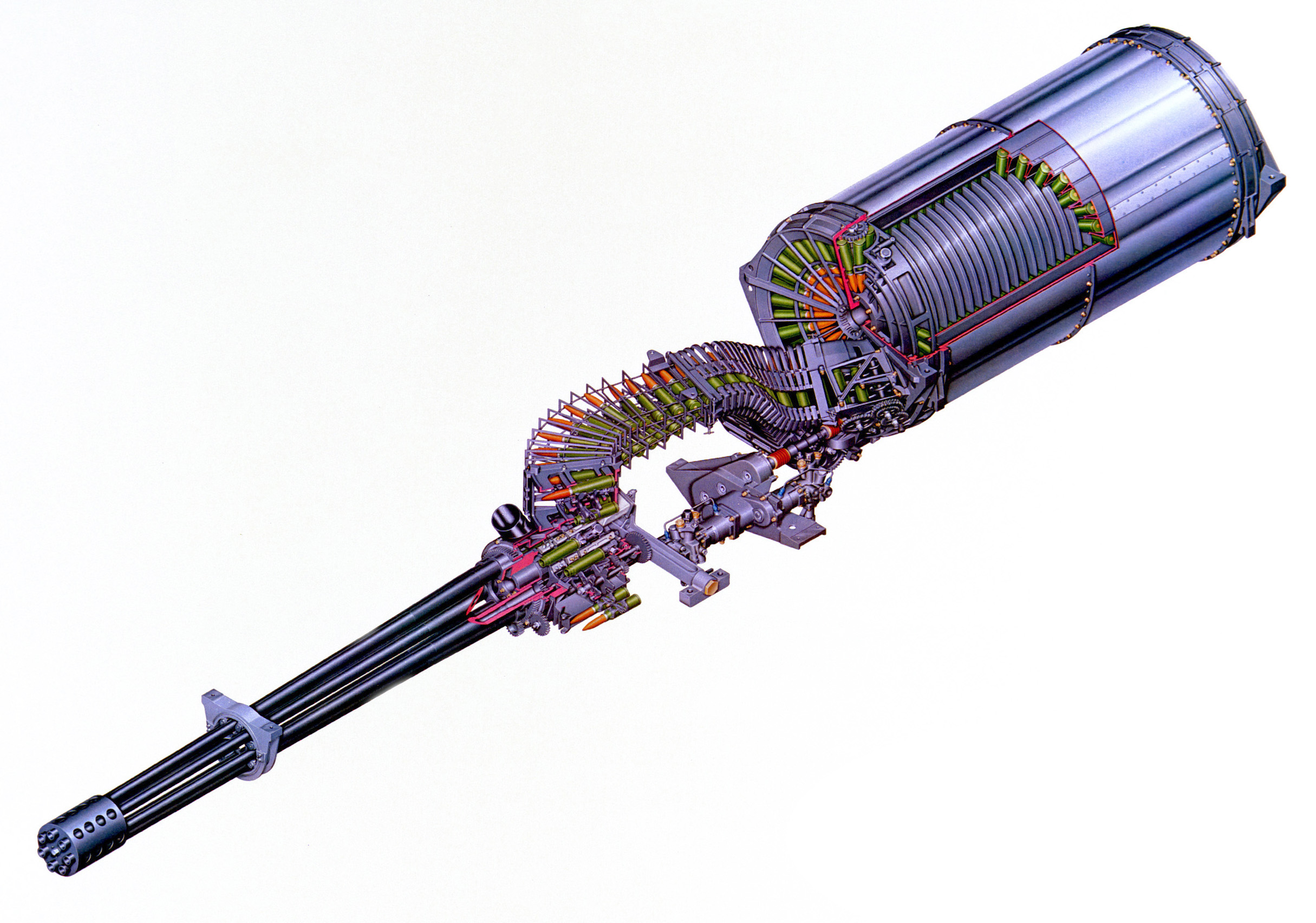 The General Electric GAU-8/A Avenger is a 30 mm, hydraulically-driven seven-barrel Gatling-type rotary cannon that is mounted on the United States Air Force’s A-10 Thunderbolt II. It is among the largest, heaviest and most powerful aircraft cannons in the United States military. Designed specifically for the anti-tank role, the Avenger delivers very powerful rounds at a high rate of fire, 3900 rounds per minute.