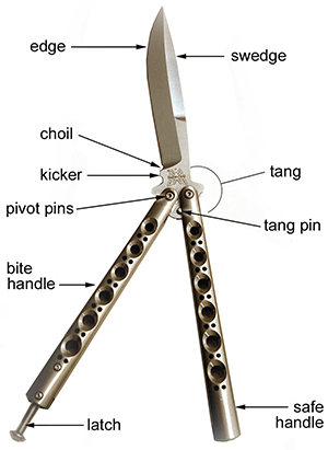 A Balisong, otherwise known as a butterfly knife or fan knife, is a folding pocket knife with two handles counter-rotating around the tang such that, when closed, the blade is concealed within grooves in the handles. It is sometimes called a Batangas knife. In the hands of a trained user, the knife blade can be brought to bear quickly using one hand. Manipulations, called ‘flipping’ or ‘fanning,’ are performed for art or amusement. The Balisong is commonly used by Filipino people as a pocket utility knife.