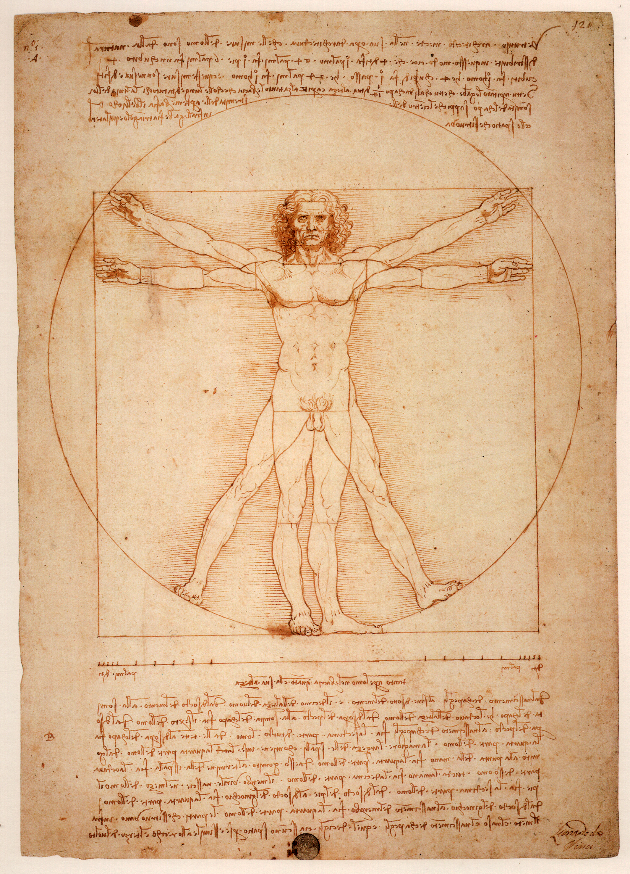 The Vitruvian [vi-troo-vee-uhn] Man is a world-renowned drawing created by Leonardo da Vinci around the year 1487. It is accompanied by notes based on the work of the famed architect, Vitruvius. The drawing, which is in pen and ink on paper, depicts a male figure in two superimposed positions with his arms and legs apart and simultaneously inscribed in a circle and square. The drawing and text are sometimes called the Canon of Proportions or, less often, Proportions of Man. It is stored in the Gallerie dell’Accademia in Venice, Italy, and, like most works on paper, is displayed only occasionally.