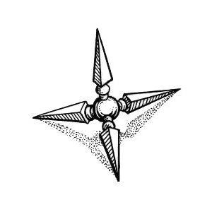A caltrop is an antipersonnel weapon made up of two or more sharp nails or spines arranged in such a manner that one of them always points upward from a stable base. They may be thought of as the landmines of antiquity, useful to shape the battlefield and force the enemy into certain paths and approaches, or to provide a passive defense as part of a defensive works system. Caltrops served to slow down the advance of horses, war elephants, and human troops. They were said to be particularly effective against the soft feet of camels. In more modern times, caltrops are used against wheeled vehicles with pneumatic tires.