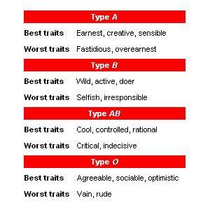 Ketsuekigata is a Japanese pseudoscience based on human blood types. There is a popular belief in Japan that a person’s ABO blood type is predictive of their personality, temperament, and compatibility with others. Ultimately deriving from ideas of historical scientific racism, the popular belief originates with publications by Masahiko Nomi in the 1970s. The scientific community dismisses such beliefs as superstition. Discussion of blood types is widely popular in women’s magazines as a way of gauging relationship compatibility with a potential or current partner. Morning television shows feature blood type horoscopes, and similar horoscopes are published daily in newspapers. In addition, a series of four books that describe people’s character by blood type ranked third, fourth, fifth and ninth on a list of best selling books in Japan in 2008.