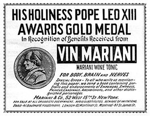 Vin Mariani was very popular in its day, even among royalty such as Queen Victoria of Great Britain and Ireland. Pope Leo XIII and later Pope Saint Pius X were both Vin Mariani drinkers. Pope Leo awarded a Vatican gold medal to the wine, and also appeared on a poster endorsing it. Thomas Edison also endorsed the wine, claiming it helped him stay awake for longer hours. This tonic evidently inspired John S. Pemberton’s 1885 cocawine drink recipe called Pemberton’s French Wine Coca.