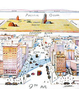 The New Yorker cover (March 29, 1976) ‘View of the World from 9th Avenue,’ has come to represent Manhattan’s telescoped interpretation of the country beyond the Hudson River. The cartoon showed the supposedly limited mental geography of Manhattanites. The image shows Manhattan’s 9th Avenue, 10th Avenue, and the Hudson River (appropriately labeled), while the top half depicts the rest of the world. The rest of the United States is drawn as a square, with a thin brown strip along the Hudson representing New Jersey, the names of five cities (Los Angeles, Washington D.C., Las Vegas, Kansas City, and Chicago) and three states (Texas, Utah, and Nebraska) are scattered among a few rocks for the U.S. beyond New Jersey.