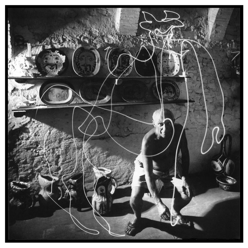 In 1949 Pablo Picasso was visited by Gjon Mili, known photographer and lighting innovator, who introduced him to some of his photographs of ice skaters with lights attached to their skates. Immediately Picasso started making images in the air with a small flashlight in a dark room. This series of photos became known as Picasso’s ‘light drawings.’ Of these photos, the most celebrated and famous is known as ‘Picasso draws a centaur in the air.’