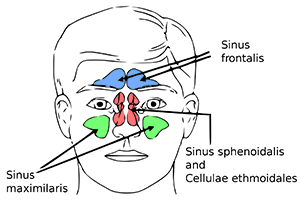 It has also been suggested they insulate sensitive structures like dental roots and eyes from rapid temperature fluctuations in the nasal cavity, and also serve to humidify and heat inhaled air. The paranasal sinuses are joined to the nasal cavity via small orifices called ostia. These become blocked easily by allergic inflammation, or by swelling in the nasal lining which occurs with a cold. If this happens, normal drainage of mucus within the sinuses is disrupted, and sinusitis may occur. These conditions may be treated with drugs such as pseudoephedrine, which causes vasoconstriction in the sinuses, reducing inflammation, by traditional techniques of nasal irrigation, or by corticosteroid.