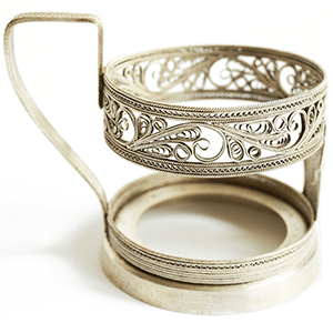 A podstakannik (Russian: ‘thing under the glass’) is a tea glass holder. The primary purpose of podstakanniks is to be able to hold a very hot glass of tea, which is usually consumed right after it is brewed. It is a traditional way of serving and drinking tea in Russia, Ukraine, Belarus, and other post-Soviet states.
