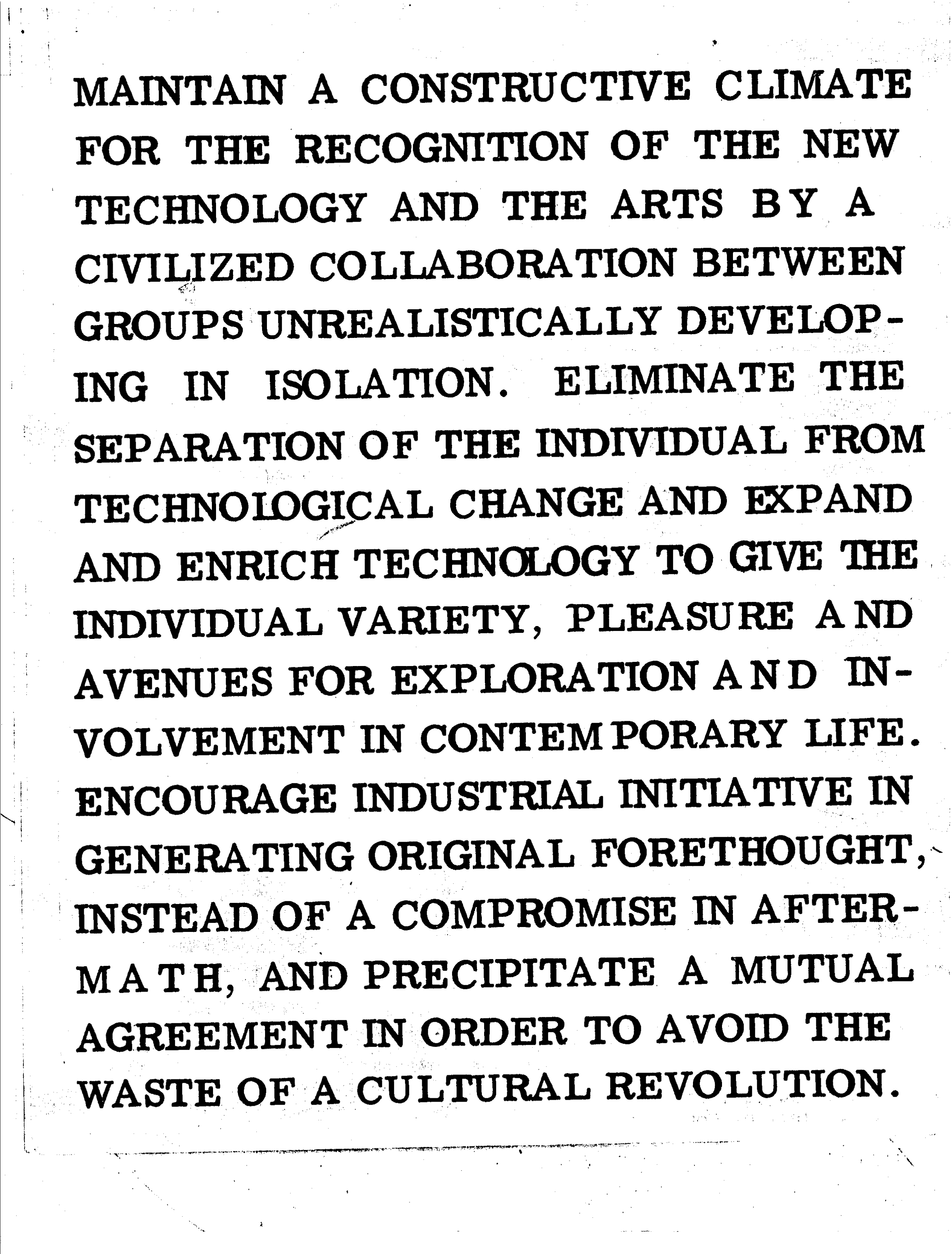 Experiments in Art and Technology (E.A.T.) was a non-profit established in 1967 to develop collaborations between artists and engineers by the engineers Billy Klüver and Fred Waldhauer and the artists Robert Rauschenberg and Robert Whitman. They had previously collaborated, most notably in 1966 for ‘9 Evenings: Theatre and Engineering,’ a series of performance art presentations that united artists and engineers. Also in 1966, 10 New York artists worked with 30 engineers and scientists from the world renowned Bell Telephone Laboratories to create groundbreaking performances that incorporated new technology. Video projection, wireless sound transmission, and Doppler sonar had never been seen in art.