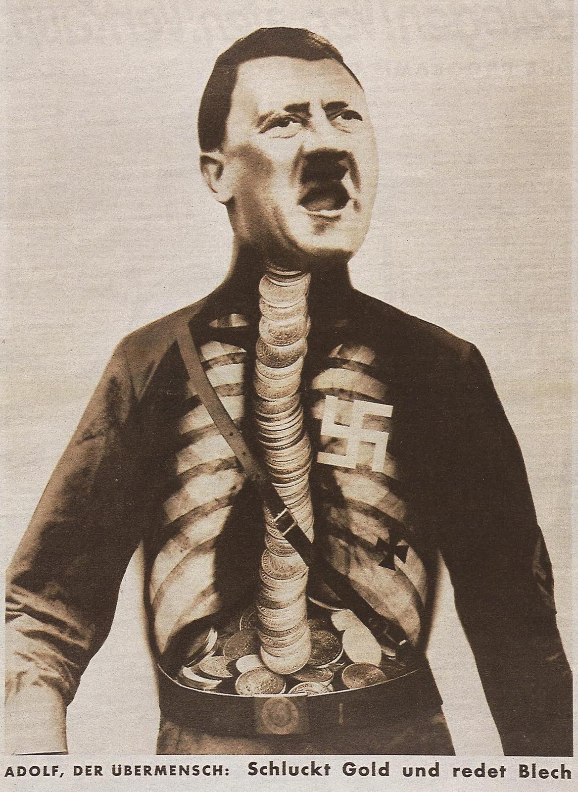 John Heartfield (1891 – 1968) born Helmut Herzfeld, was a pioneer in the use of art as a political weapon. His photomontages were anti-Nazi anti-Fascist statements.