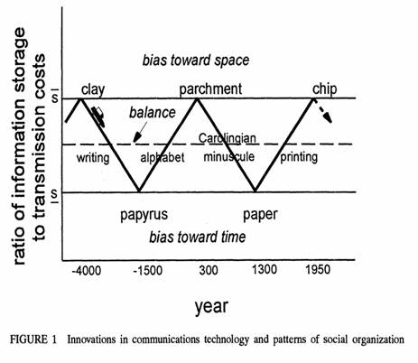 One of Innis’s primary contributions to the field of communications was to apply the dimensions of time and space to various media. He divided media into time-biased and space-biased types. Time-biased media include clay or stone tablets, hand-copied manuscripts on parchment or vellum and oral sources such as Homer’s epic poems. These are intended to carry stories and messages that last for many generations, but tend to reach limited audiences. Space-biased media are more ephemeral. They include modern media such as radio, television, and mass circulation newspapers that convey information to many people over long distances, but have short exposure times. While time-biased media favour stability, community, tradition and religion, space-biased media facilitate rapid change, materialism, secularism, and empire.