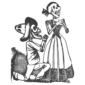 A calaca [kal-ah-kuh] (a colloquial Mexican Spanish name for skeleton) is a figure of a skull or skeleton (usually human) commonly used for decoration during the Mexican Day of the Dead festival, although they are made all year round. Tracing their origins from Aztec imagery, calacas are frequently shown with marigold flowers and foliage. As with other aspects of the Day of the Dead festival, calacas are generally depicted as joyous rather than mournful figures. They are often shown wearing festive clothing, dancing, and playing musical instruments to indicate a happy afterlife. This draws on the Mexican belief that no dead soul likes to be thought of sadly, and that death should be a joyous occasion. This goes back to Aztec beliefs, one of the few traditions to remain after the Spanish conquest.