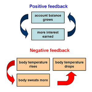 Negative feedback occurs when the output of a system acts to oppose changes to the input of a system, acting to stabilize it. The classic example is a central heating system which cuts off when a (suitably placed) temperature sensor hits a pre-set mark. The negative feedback part is the thermostat. Negative feedback is a basic concept of cybernetics (the theory of communication and control based on regulatory feedback in animals and machines).