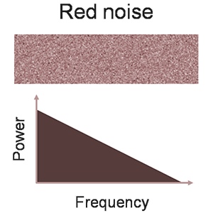 ‘Red noise,’ also called Brown noise or Brownian noise, refers to a system where power density decreases with increasing frequency. ‘Brown’ noise is not named for a power spectrum that suggests the color brown; rather, the name is a corruption of Brownian (random) motion. It is also known as ‘random walk’ or ‘drunkard’s walk’ noise. Unlike pink, red, and brown noise, blue (or azure) noise’s power density increases with increasing frequency. In computer graphics, the term ‘blue noise’ is sometimes used more loosely as any noise with minimal low frequency components and no concentrated spikes in energy. This can be good noise for dithering (the intentional use of noise to reduce the error of compression). Retinal cells are arranged in a blue-noise-like pattern which yields good visual resolution.