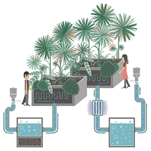 The Living Machine is an intensive bioremediation system that can also produce beneficial byproducts, such as reuse-quality water, ornamental plants and plant products—for building material, energy biomass, animal feed.