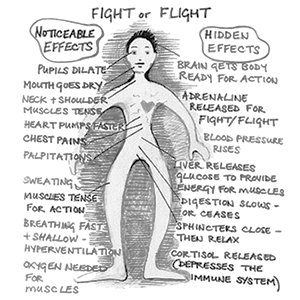 Upon being stimulated by fear or anger, the adrenal medulla may automatically produce the hormone epinephrine (adrenaline). This can have various effects on various bodily systems, including increasing the heart rate up to 200 – 300 beats per minute (a pulse above 250 bpm can cause fainting). Other symptoms include: Dilation of the bronchial passages, permitting higher absorption of oxygen; Dilated pupils to allow more light to enter, and visual exclusion—tunnel vision—occurs, allowing greater focus but resulting in the loss of peripheral vision; and Release of glucose into the bloodstream, generating extra energy by raising the blood sugar level. It is also possible to experience auditory exclusion or sensitivity, and it is common for individuals to experience an increased pain tolerance, loss of color vision, short term memory loss, decreased fine motor skills, decreased communication skills, or decreased coordination.