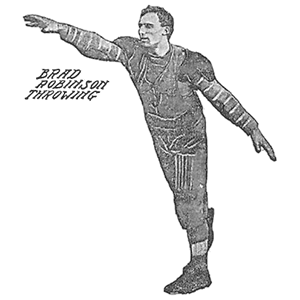 Most sources credit St. Louis University’s Bradbury Robinson from Bellevue, Ohio with throwing the first legal forward pass. On September 5, 1906, in a game against Carroll College, Robinson’s first attempt at a forward pass fell incomplete and resulted in a turnover under the 1906 rules. In the same game, Robinson later completed a 20-yard touchdown pass to Jack Schneider. The 1906 St. Louis University team was coached by Eddie Cochems. Football authority and College Football Hall of Fame coach David M. Nelson wrote that ‘E. B. Cochems is to forward passing what the Wright brothers are to aviation and Thomas Edison is to the electric light.’
