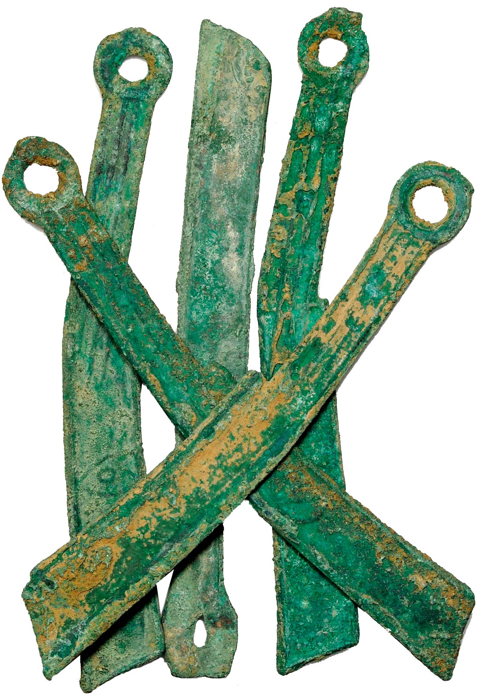 Knife money refers to large, cast, bronze, knife-shaped coins produced by Ancient Chinese governments and kingdoms approximately 2500 years ago. They had holes on the end to be easily strapped onto belts or rings. Known as ‘jin cuo dao’ in Chinese, knife money circulated in China between 600 to 200 BCE during the Zhou dynasty. There are several stories that attempt to explain how knife money was introduced but it is not certain if any or all are true.