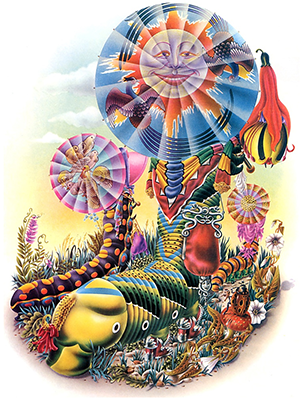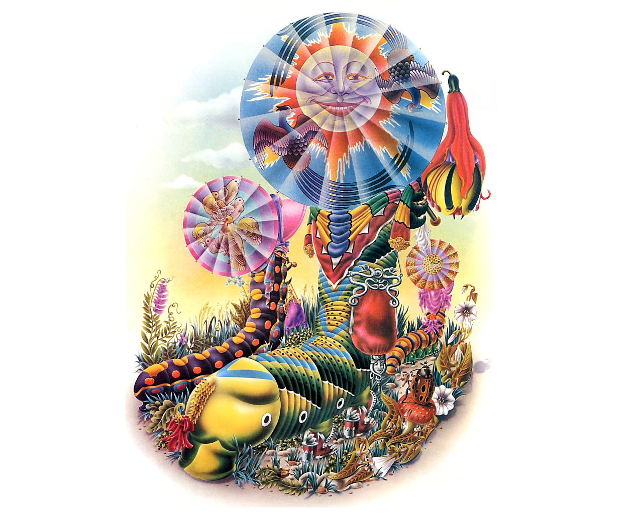 His work is characterized by a flowing, cartoony style and soft airbrushing – very much in step with the psychedelic styles of the times. In the theater, in 1969 he designed the graphics for controversial Jane Arden play ‘Vagina Rex and the Gas Oven.’ He is possibly best known, however, for the picture book ‘The Butterfly Ball and the Grasshopper Feast’ (1973), a series of illustrations of anthropomorphic insects and other creatures, which he created in collaboration with William Plomer, who wrote the accompanying verses. This was based on William Roscoe’s poem of the same name, but was inspired when Aldridge read that John Tenniel had told Lewis Carroll it was impossible to draw a ‘wasp in a wig’.